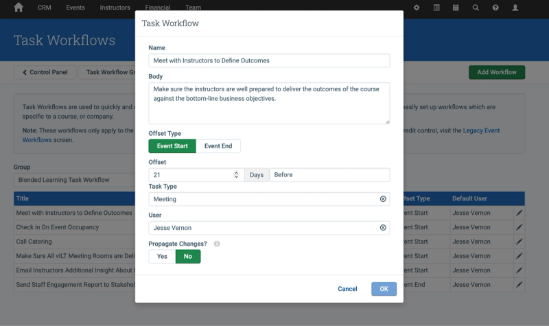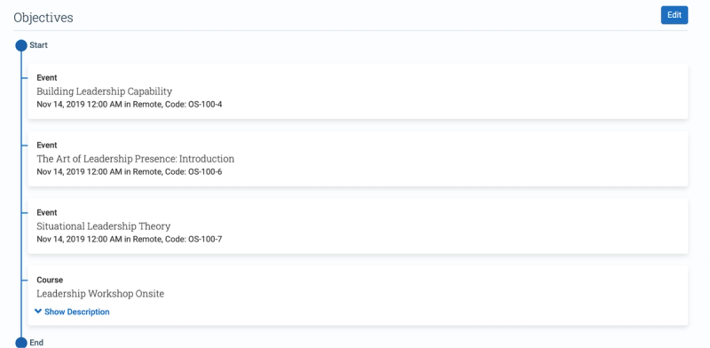 Course templates are connected to other critical learning and business systems. This allows changes made to the course template to trigger workflows for other team members, send bulk email communications to alert instructors and learners to your changes, and quickly edit events related to the course throughout your program.
